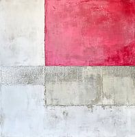 Channels of Calm Red - Dit abstract schilderij toont een groot, dominant magenta rood vierkant aan de bovenkant en een reeks witte en grijsachtige blokken eronder, wat een minimalistische maar krachtige indruk achterlaat.