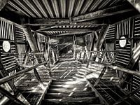 Deze zwart-witfoto van het interieur van de uitkijktoren bij het Fochterloërveen, nabij Appelscha, is door digitale bewerking getransformeerd tot een intrigerend kunstwerk met een bijna surrealistische sfeer. De strakke perspectieflijnen in de foto worden versterkt en vervormd, wat doet denken aan het spel met ruimte en oneindigheid dat…