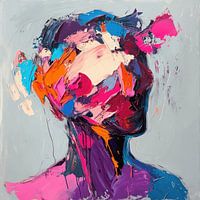 Chaos van Gedachten is een explosief en emotioneel kunstwerk dat de complexiteit van de menselijke geest visualiseert. Het gezicht van de figuur, bijna onherkenbaar onder dikke lagen expressieve verf, lijkt te versmelten met zijn omgeving, alsof gedachten en emoties letterlijk uit elkaar spatten. De dynamische penseelstreken in felle tinten roze, oranje, blauw en paars geven een gevoel van beweging—als een storm van gevoelens die zich niet laten vangen in één enkele vorm.