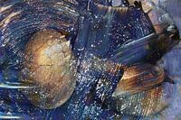 Abstracte mixed media, acrylverf op canvas in blauw,paars en goud tinten, met gebarsten ei vormen
