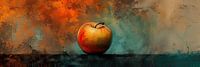 Chaotic Serenity - Dit fruit schilderij kenmerkt zich door een gedetailleerde en levendig gekleurde appel die centraal staat tegen een dynamische, abstracte achtergrond. De appel, met zijn gladde textuur en natuurlijke glans, vertoont tinten van geel en rood, die naadloos in elkaar overgaan, waardoor het fruit een bijna driedimensionaal effect krijgt. Er is een duidelijke lichtbron die de contouren en kleurschakeringen van de appel accentueert, wat bijdraagt aan de realistische weergave. Rondom de appel speelt zich een achtergrond af met een explosie van oranje en blauwe tinten, gemengd met elementen van zwart en wit die textuur en diepte geven. Deze achtergrond bevat willekeurige, abstracte vormen en spatten verf, wat een gevoel van beweging en chaos creëert, contrasterend met de serene en haast perfecte uitstraling van de appel.