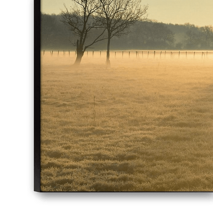 Charentevallei bij zonsopgang onder een lichte winterse mist