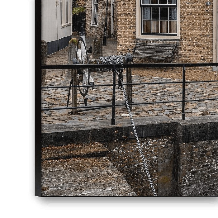 Deze foto is perfect voor liefhebbers van historische architectuur, Nederlandse stadsgezichten, en voor ondernemers of kantoren die de sfeer en identiteit van Goedereede in hun ruimte willen brengen.