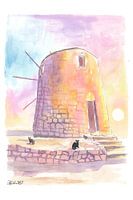 Charmante Griekse eilandwindmolen Middellandse Zee bij zonsondergang met katten