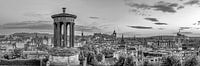 Prachtige monochrome impressie van Calton Hill. De eerste lichtjes verlichten de historische stad. Uitzicht langs het Dugald Stewart Monument naar de Balmoral Tower en Edinburgh Castle. Edinburgh Castle is het herkenningspunt en kenmerkt het beeld van de Schotse hoofdstad met zijn imposante ligging op Castle Rock, de krater van een…