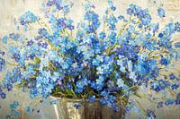 Charming Blue Flower Arrangement - Dit bloemen schilderij toont een uitbundige vaas met vergeet-me-nietjes in diverse kleuren blauw, waarvan de vrolijke gele kern en de frisse groene stelen een levendige uitstraling geven aan het geheel.