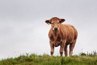 Een bruine koe staat waakzaam in een weiland tegen de achtergrond van een bewolkte lucht. Haar ogen zijn recht op de camera gericht, met een zachte maar nieuwsgierige uitdrukking. Deze lieve vaars is een van de koeien van mijn buurman, onderdeel van zijn Charolais zoogkudde, hier in het westen van Ierland.