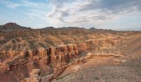 Een adembenemend uitzicht op de Charyn Canyon in Kazachstan, waar imposante rotsformaties en diepe kloven elkaar afwisselen. De roestkleurige tinten van de canyon worden versterkt door het warme zonlicht, terwijl de schaduwen de diepte en structuur van de kloven benadrukken. Kleine details, zoals de verweerde patronen in het gesteente en de subtiele groene accenten van planten die zich aan de rotsen vastklampen, brengen het landschap tot leven.