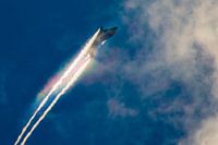 Een F-35B van de Royal Air Force demonstreert zijn capaciteiten tijdens de Royal International Air Tattoo in Fairford in het Verenigd Koninkrijk en veroorzaakt een regenboog.
