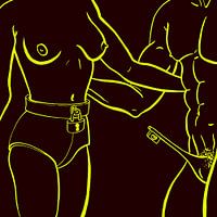 Illustratie van twee mensen die duidelijk voor elkaar gemaakt zijn. Vrouw met kuisheidsgordel en man met bijbehorende sleutel. Deze illustratie is in zwart met gele lijnen gemaakt.