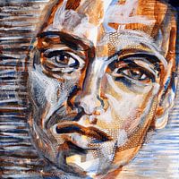 Portret van een jonge man. Het is een collage waarin is gewerkt met verschillende soorten papier, gecombineerd met dekkende en transparante verf in natuurlijke, warme kleuren met een vleugje blauw. Hij denkt na, waar is hij met zijn gedachten? De blik is vredig, maar ook nieuwsgierig.