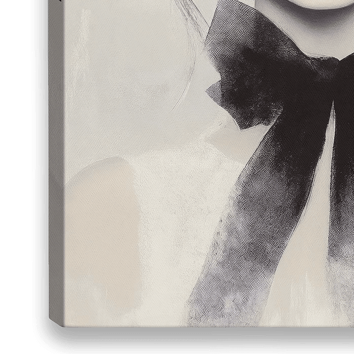 Een frisse en speelse uitstraling komt je tegemoet in dit portret. De vrouw straalt pure jeugdigheid uit met haar grote, sprankelende blauwe ogen en haar lichtroze wangen. Haar donkere, losjes opgestoken haar wordt opgefleurd door een zachte roze bloem, terwijl de grote zwart-blauwe strik om haar nek een modieuze, vrolijke touch…