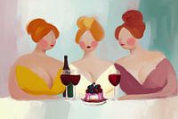 "Cheers to Curves!" Deze dames weten hoe ze van het leven moeten genieten: een goed glas rode wijn, een gezellige babbel en een lekker taartje op tafel. 'Vol' van het leven, letterlijk én figuurlijk. Met hun rozerode wangen en stralende rondingen laten ze zien dat het leven altijd mooier wordt met een lekker wijntje in de hand. Een ode aan de borrel, de vriendschap en het plezier dat bij elke slok groter wordt. Cheers!"