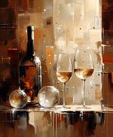 Abstract tafereel van een fles met twee wijnglazen op een tafel.