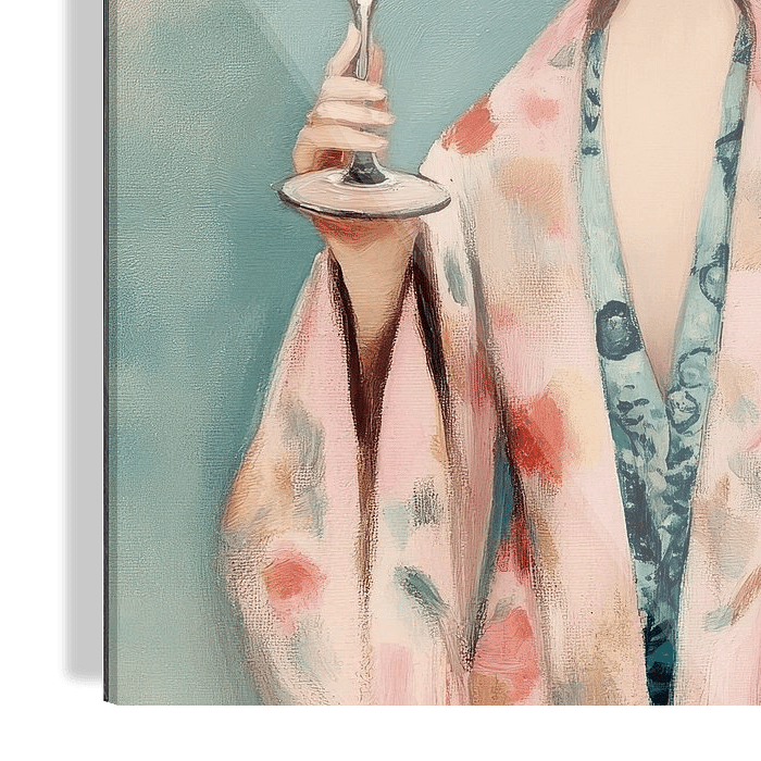 Cheers! Vrolijke illustratie, portret van een vrouw met grote zonnebril, bloem in het haar en een glas wijn in haar handen. Een bijzondere blikvanger voor ieder interieur!