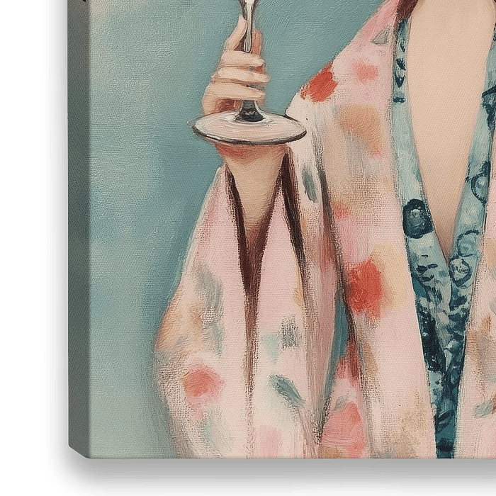 Cheers! Vrolijke illustratie, portret van een vrouw met grote zonnebril, bloem in het haar en een glas wijn in haar handen. Een bijzondere blikvanger voor ieder interieur!