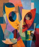 Kleurrijke abstractie met twee maskers en een grove hout textuur.