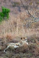 Een jachtluipaard, of cheeta die licht te rusten in het gras. De foto is in de portretstand gemaakt.