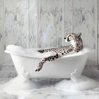 Deze originele badkamerfoto is een echte blikvanger! Met een vrolijk jachtluipaard dat geniet van de rust van zijn bad, brengt het charme en humor in elke moderne badkamer. De zwart-wit fotografie benadrukt de tijdloze elegantie, terwijl de scène zelf opvalt tussen de grappige badkamerfoto's. Dit werk is ideaal voor het ontwerp van een toilet of badkamer en herinnert eraan dat dieren ook toiletmomenten kunnen hebben. Deze moderne serie badkamerfoto's biedt een onconventionele decoratie die zowel een glimlach op je gezicht tovert als je badkamer verfraait. Met deze decoratieve badkamerafbeelding kun je een unieke sfeer creëren en inspirerende interieurideeën vinden voor je toilet.