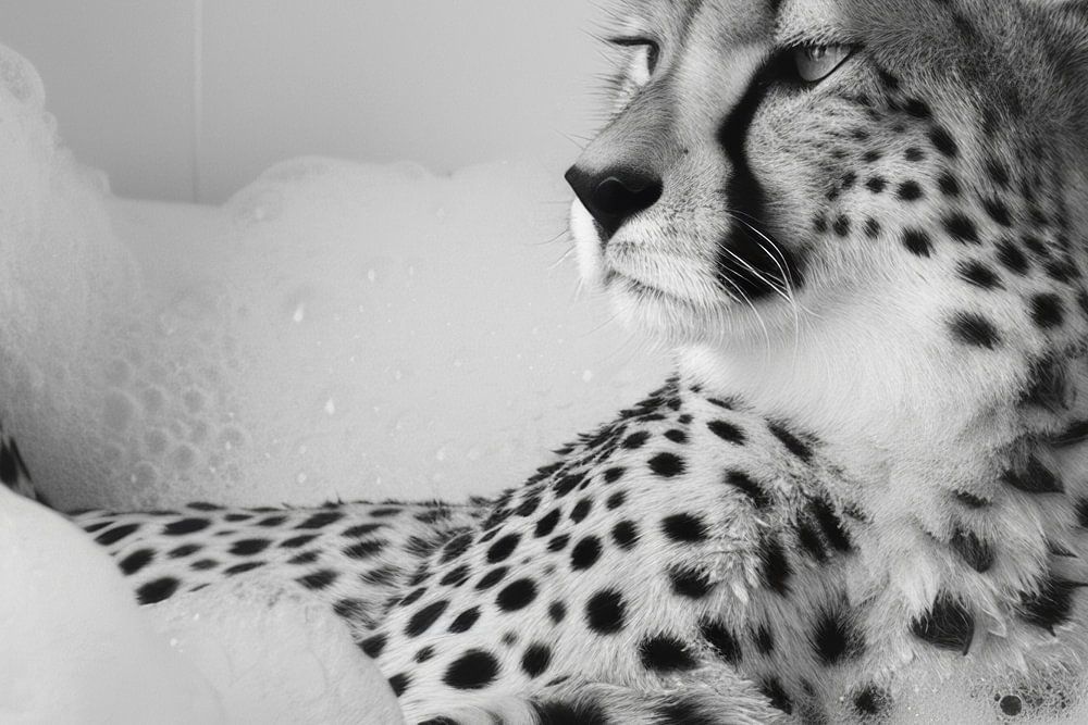 Deze originele badkamerfoto is een echte blikvanger! Met een vrolijk jachtluipaard dat geniet van de rust van zijn bad, brengt het charme en humor in elke moderne badkamer. De zwart-wit fotografie benadrukt de tijdloze elegantie, terwijl de scène zelf opvalt tussen de grappige badkamerfoto's. Dit werk is ideaal voor het ontwerp van een toilet of badkamer en herinnert eraan dat dieren ook toiletmomenten kunnen hebben. Deze moderne serie badkamerfoto's biedt een onconventionele decoratie die zowel een glimlach op je gezicht tovert als je badkamer verfraait. Met deze decoratieve badkamerafbeelding kun je een unieke sfeer creëren en inspirerende interieurideeën vinden voor je toilet.