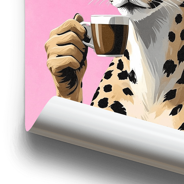 Een jachtluipaard met een witte handdoek tulband en een klein espressokopje in zijn hand - het tafereel is tegelijkertijd nobel, humoristisch en perfect in balans. De doordringende blik en trotse houding geven de afbeelding een speciale aanwezigheid, die elegant wordt geaccentueerd door het eenvoudige kleurenschema en de kalme…