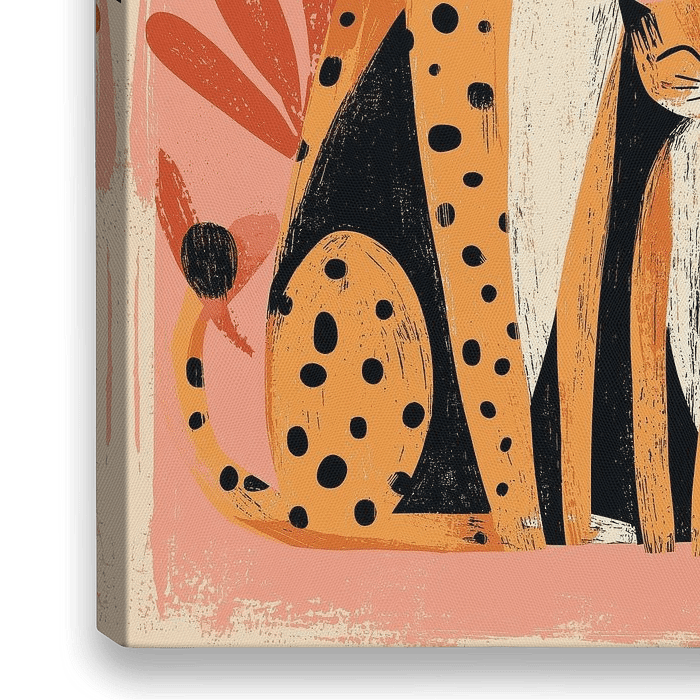 Een gestileerde cheeta-moeder met haar jong onder een warm stralende zon. Minimalistische vormen, zachte texturen en harmonieuze terracottatinten geven het motief een moderne, eigentijdse esthetiek met een rustige uitstraling.