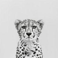 Ontdek de indrukwekkende elegantie van het wild met dit adembenemende zwart-wit portret van een jachtluipaard. De gedetailleerde afbeelding vangt perfect de majestueuze aanwezigheid en intense ogen van dit betoverende roofdier. Het monochrome kleurenschema versterkt de contrasterende patronen van de vacht van het jachtluipaard en brengt…
