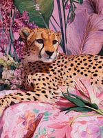 Een elegante cheetah ligt ontspannen op een roze ondergrond vol bloemenprints, omringd door weelderige tropische bladeren en bloesems. De warme oranje tinten van zijn vacht contrasteren prachtig met de zachte roze en paarse kleuren van de achtergrond. Een levendig en stijlvol kunstwerk dat wilde kracht en sierlijke schoonheid samenbrengt.