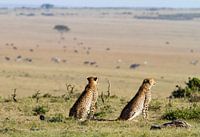 Twee jachtluipaarden observeren de dieren op de Masai Mara vlakte, Kenia.