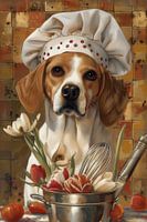 Dit prachtige kunstwerk toont een beagle die met een koksmuts op serene wijze in een keuken staat, omringd door verse tulpen en keukengerei. De warme, gedetailleerde achtergrond geeft het werk een rustieke en gezellige uitstraling. De zorgvuldige combinatie van bloemen, kookgereedschap en de geconcentreerde blik van de hond zorgt voor een harmonieuze balans tussen speelsheid en verfijning. Perfect voor liefhebbers van huisdierenportretten en culinaire kunst met een vleugje elegantie.