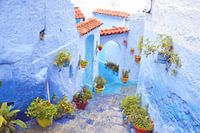 Straatje in de blauwe stad in noord Marokko. Deze stad wort Chefchaouen of Chaouen en de medina is blauw en wit geschilderd.
