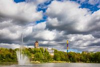 Als u over de kasteelvijver in Chemnitz kijkt, ziet u de grote fontein, de kasteelkerk, de Miramar en de kleurrijke schoorsteen. Op deze lentedag in mei trok een indrukwekkende wolkenformatie over Chemnitz.