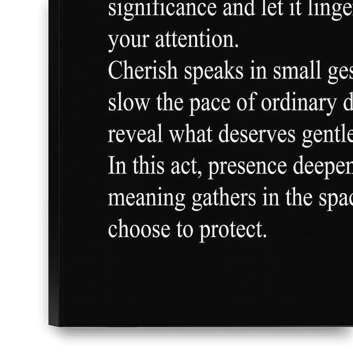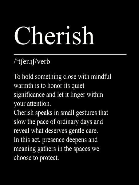 Deze definitie poster toont het Engelse woord "Cherish" in heldere, minimalistische typografie. De term staat voor bedachtzame waardering, zorg en het bewust bewaren van wat belangrijk is.