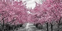 De tijd van de kersenbloesem markeert het begin van de lente. Het pad loopt onder een bladerdak van duizenden en duizenden bloesems. Een idyllische zwart-wit opname met de bloesems in kleur.