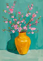 Een gouacheschilderij toont een grote gele vaas gevuld met roze kersenbloesems, frontaal gepresenteerd tegen een turquoise achtergrond. Getekend en geschilderd met gouacheverf, maakt het schilderij gebruik van platte kleuren en een eenvoudig ontwerp. De turquoise achtergrond vormt een rustgevend contrast voor de levendige bloesems in de vaas.