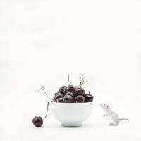 Stilleven met humor , kersen en muis . brengt een aparte sfeer in uw huis en een glimlach op de mond . Ook leuk als poster of muur behang.