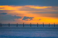 De avond valt en de lucht boven de Chesapeake Bay in Virginia Beach (VA) kleurt in adembenemende tinten blauw en oranje. Het landschap lijkt een schilderij, waarin de gelaagde wolken en de strakke, horizontale lijnen van de horizon een prachtig contrast vormen met de delicate netten van de crabvissers op de voorgrond.