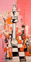 Dit expressieve werk brengt de nobele sport van schaken tot leven op een abstracte, maar herkenbare manier. De majestueuze koning staat centraal, omringd door zijn getrouwe schaakstukken, elk met hun eigen karakter en belang in het spel. De achtergrond is een vloeiende combinatie van zachte roze en oranje tinten die de concentratie en intensiteit van een schaakpartij oproepen. De abstracte stijl nodigt de beschouwer uit tot een eigen interpretatie en reflectie op de strategische diepten van het schaakspel.