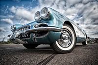 Krachtig beeld van een Chevrolet Corvette, model C1, uit 1959. De chrome grill steekt goed af tegen een mooie wolkenlucht. Door de gekozen hoek straalt deze klassieker kracht uit.
