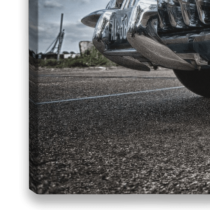 Krachtig beeld van een Chevrolet Corvette, model C1, uit 1959. De chrome grill steekt goed af tegen een mooie wolkenlucht. Door de gekozen hoek straalt deze klassieker kracht uit.