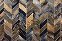 Dit werk toont een strak chevronpatroon in verschillende tinten goud en zwart. De afwisseling van texturen en metallic tinten creëert een modern en stijlvol visueel effect. De geometrische vormen en de combinatie van kleuren zorgen voor een eigentijdse uitstraling.