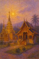 Als de schemering valt in Chiang Mai, glinsteren de tempels onder een honingzoete hemel. Hun gouden daken en torenspitsen lijken te pulseren van warmte, het laatste licht opvangend voordat het nacht wordt. In dit schilderij kanaliseert de kunstenaar Claude Monets fascinatie voor de kleuren en atmosfeer van zonsondergangen, maar vermengt deze met Zuidoost-Aziatische stilte en heilige gloed.