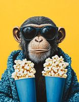 Een chimpansee draagt een zonnebril en een stijlvol blauw geïnspireerde outfit, terwijl hij nonchalant een bak popcorn vasthoudt. Deze gouache illustratie is uitgevoerd op een levendige gele achtergrond, waarbij de moderne kunststijl en minimalistische benadering zorgen voor een opvallend en eigentijds kunstwerk. De eenvoud van de…