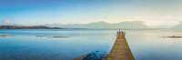 Loopbrug aan de Chiemsee met uitzicht op het meer en de bergen op een winterse dag