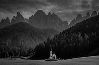 Een bekende plek in het Val di Funes in de Dolomieten. Een barokke kapel tussen de bergweiden en bossen, met een klokkentoren met koperen koepel en een gevel met fresco: Chiesetta di San Giovanni in Ranui
