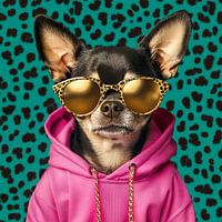 Deze kleurrijke afbeelding toont een coole Chihuahua in een levendige Pop Art-stijl, met felle, contrasterende kleuren en gewaagde patronen. De gouden zonnebril en serieuse uitdrukking van de hond stralen energie en humor uit, waardoor de afbeelding meteen een glimlach op je gezicht tovert. Een afbeelding met een speelse, moderne uitstraling die perfect zou passen als een opvallend, vrolijk accent in elk interieur.