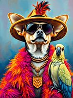 Dit opvallende schilderij toont een pittbull zoals je die zelden ziet: zelfverzekerd, elegant en met een uitgesproken gevoel voor stijl. De hond staat fier rechtop en is gehuld in een flamboyante roze verenjas die direct de aandacht trekt. Op zijn kop draagt hij een lichte hoed, gecombineerd met…
