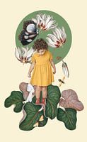 Dit lieve kunstwerk is een collage van verschillende (vintage en botanische) afbeeldingen en heeft een zachtgele achtergrond.
