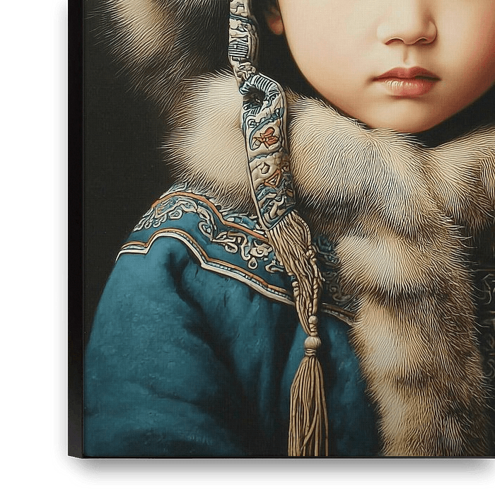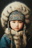 Een jong kind, gehuld in bont en traditioneel geborduurde kleding, kijkt recht de toeschouwer aan. De zachte warmte van de pels contrasteert met de strenge kou van haar wereld, maar in de ogen gloeit een innerlijk vuur.