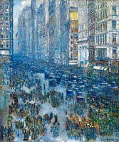 De drukte van de stad die nooit slaapt. Deze drukke straat in de Amerikaanse stad New York zindert van de koetsen en wandelaars. Als altijd hier hebben mensen haast om ergens te komen in de agglomeratie.
